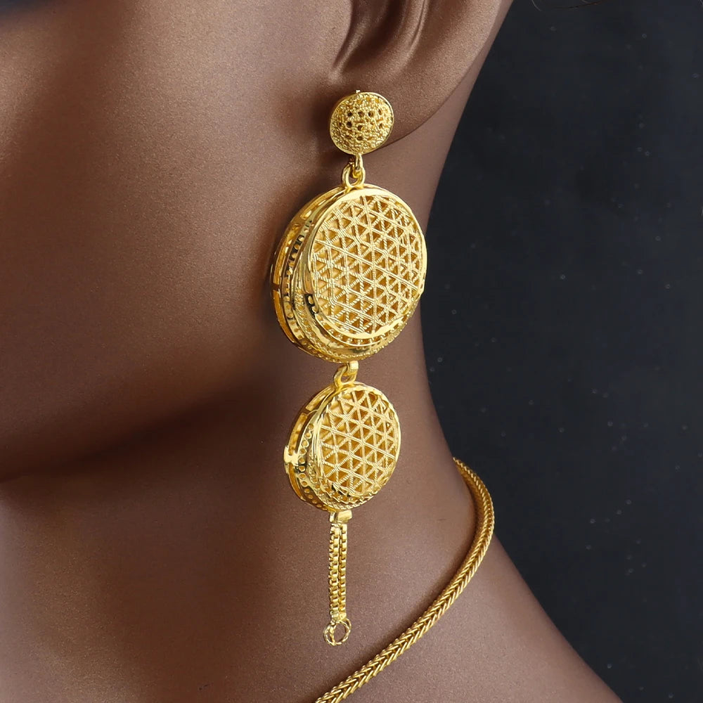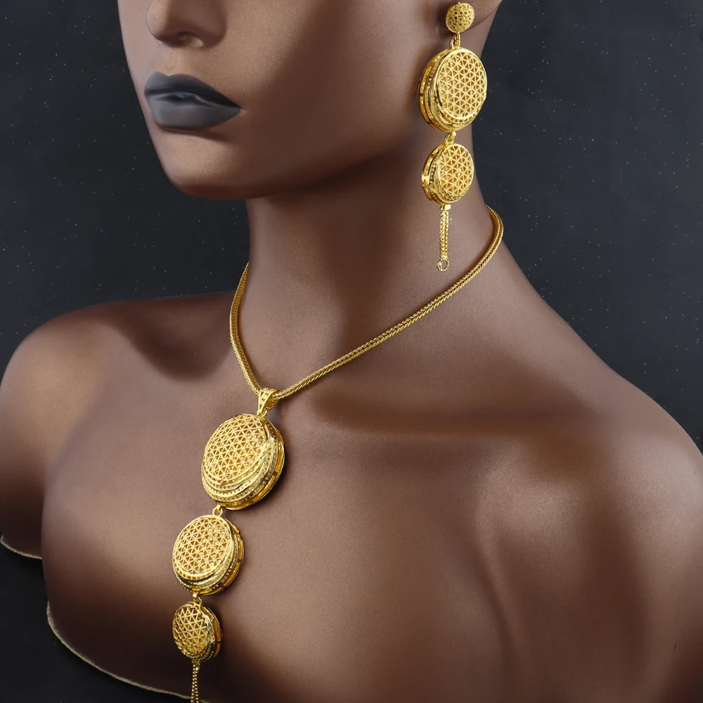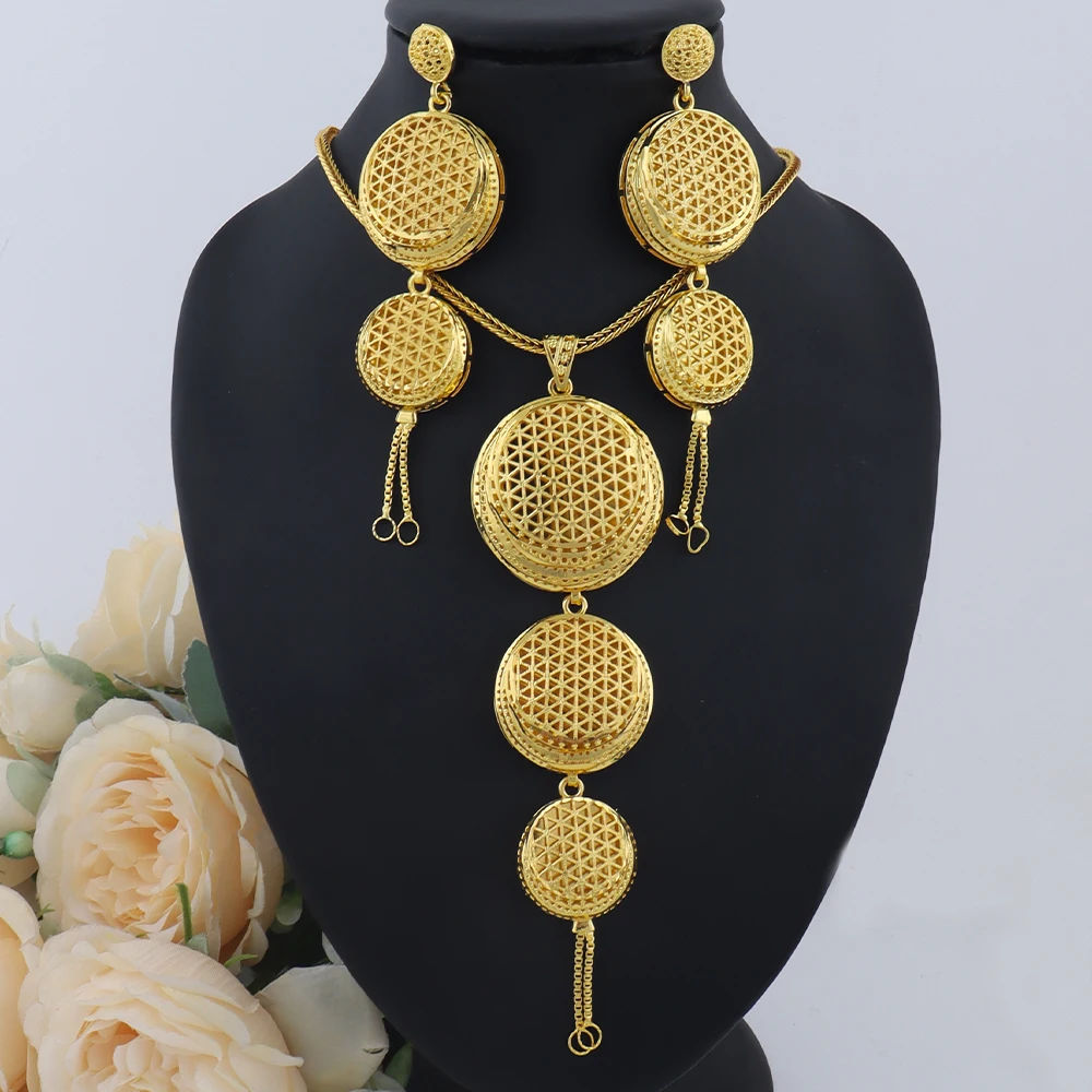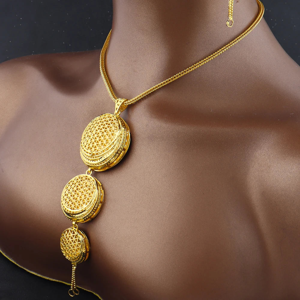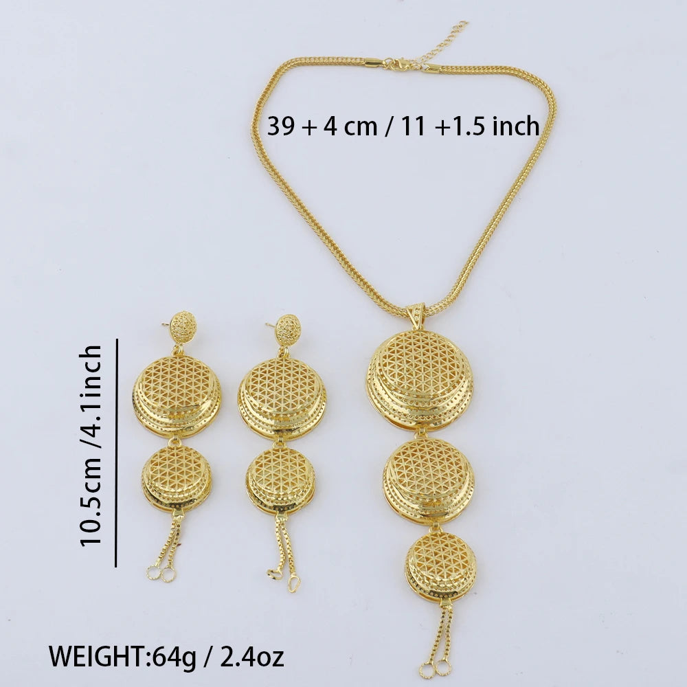 Dubai Africa Round Jewelry Brass 24k Gold Plated Pendant Earrings Necklace Hollow Jewelry Set for Women and Africa Jewelly Set