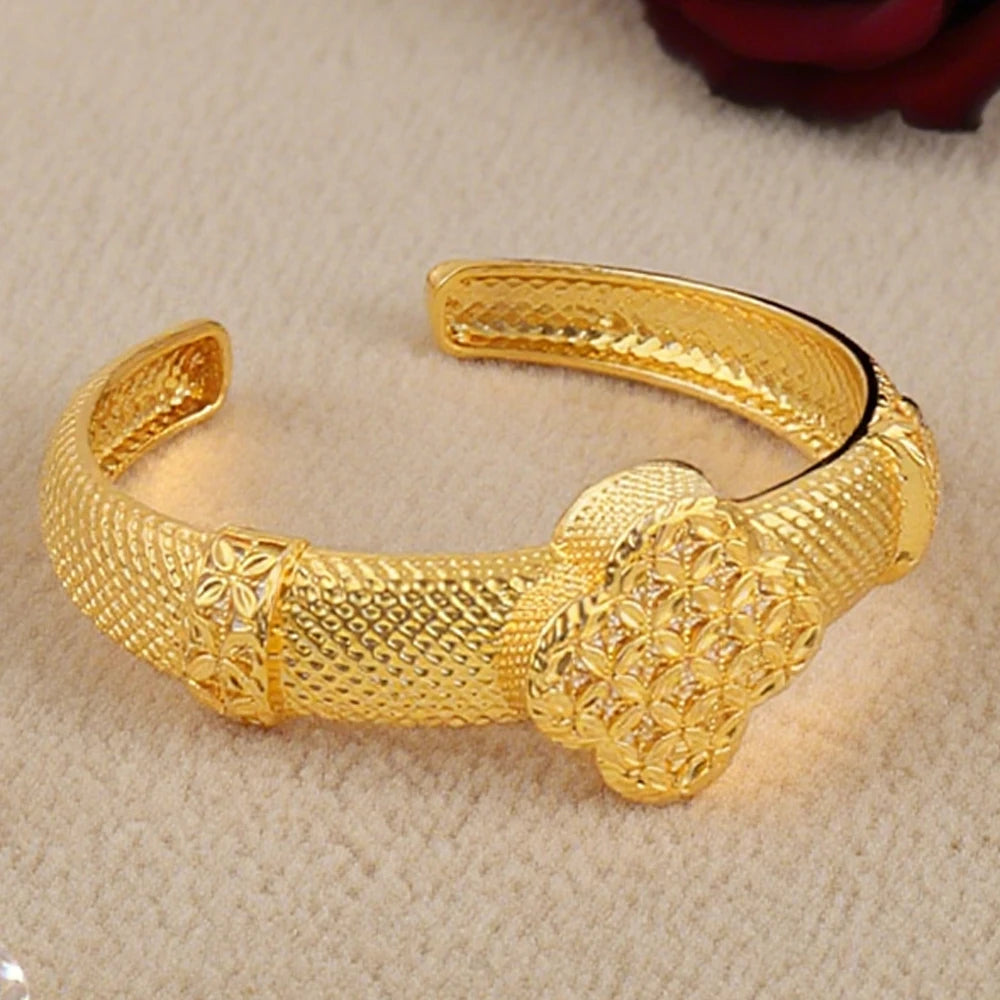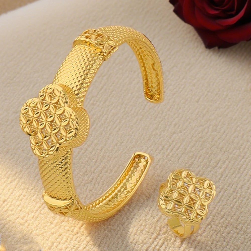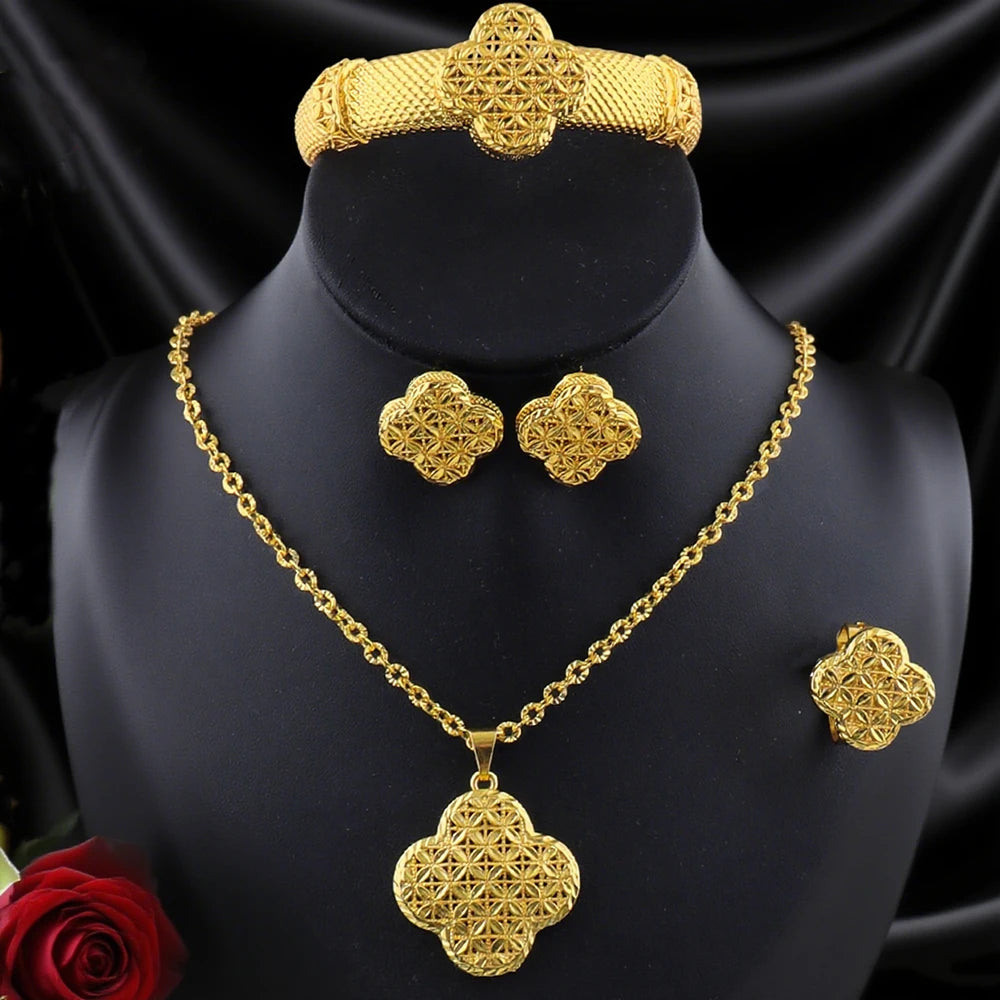 Dubai Gold Plated Earrings Necklace Bangle Ring Sets For Women India Luxury Flower Shape Jewelry Sets for Banquet Wedding Gift