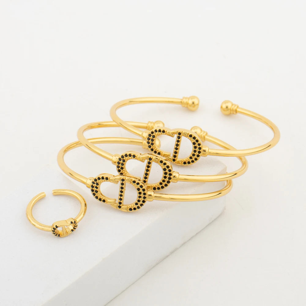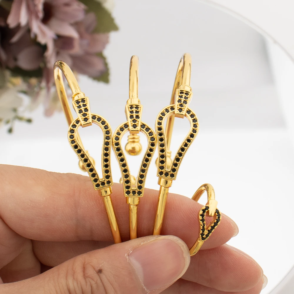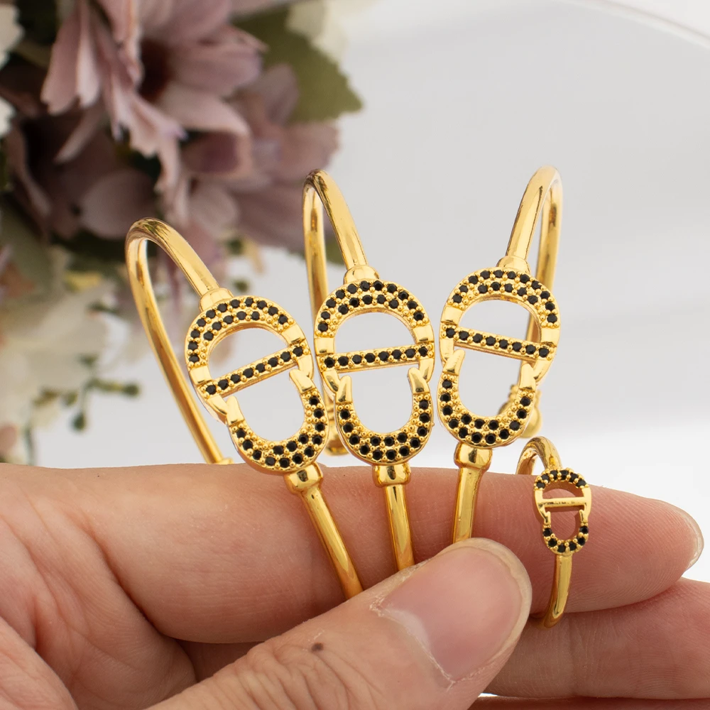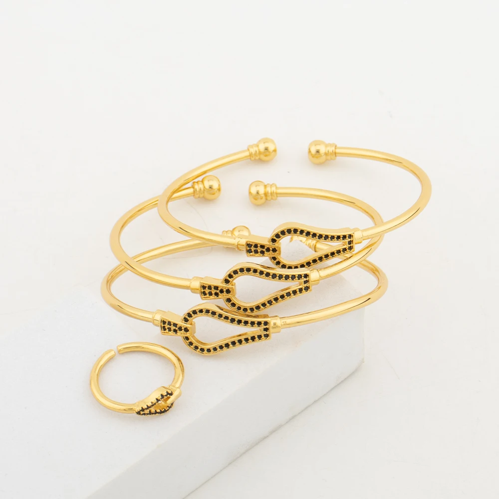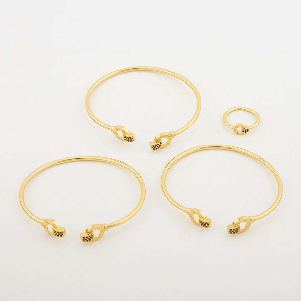 Fashion Bangle with Ring Gold Color Cuff Bracelet Women Italy African Dubai Luxury Wedding Jewelry Set