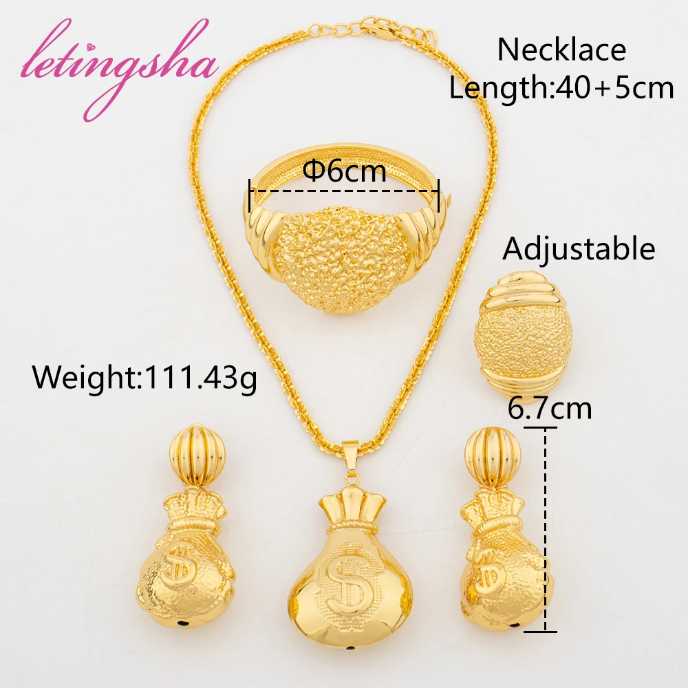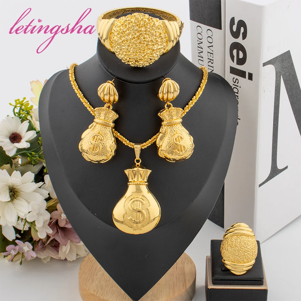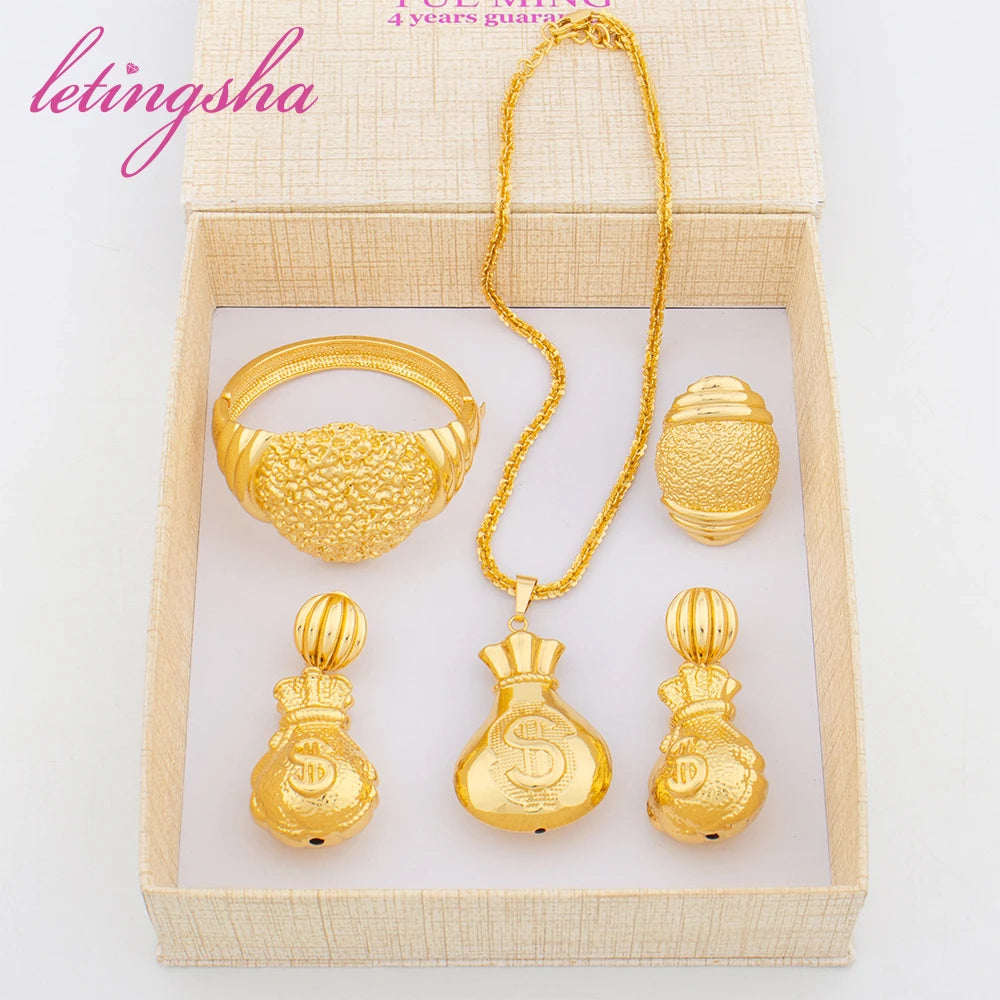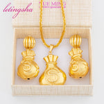 Fashion Luxury Lucky Bag Design Drop Earrings Pendant Set Gold Plated Bangle Rings Classic Gold Color Jewelry Set Party Gifts