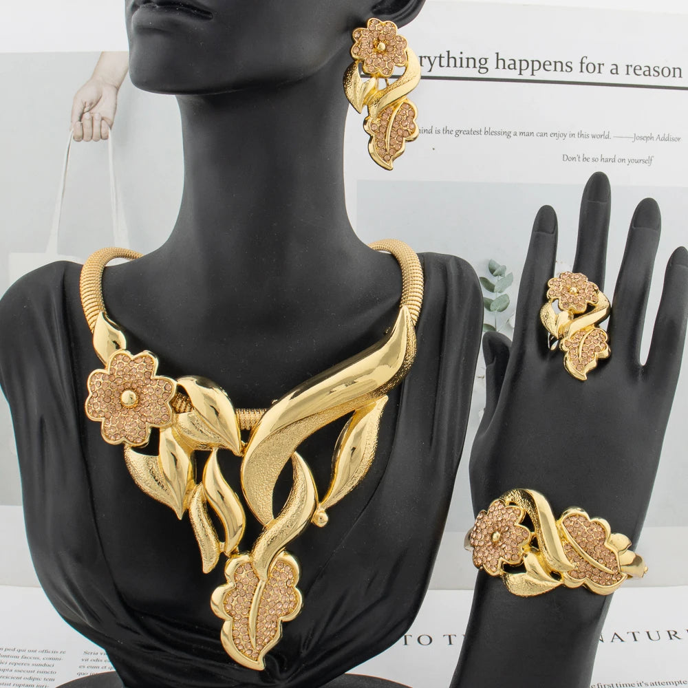 Luxury Flower Lady Jewelry Set Women 18k Gold Color Micro Inlaid Crystal Pendant Necklace Earrings Bridal Nigerian Accessories
