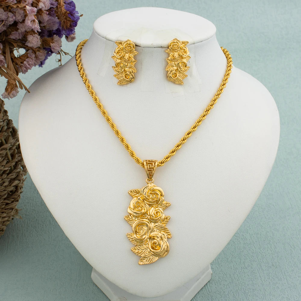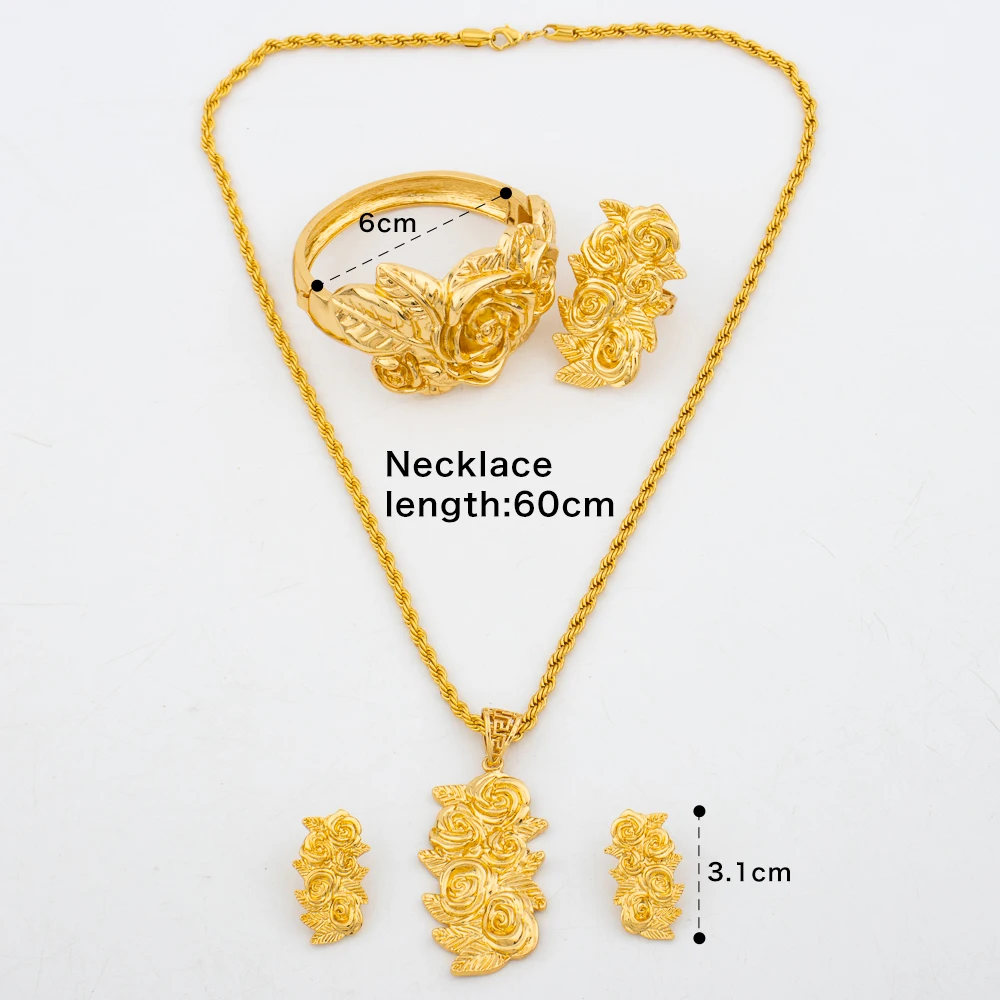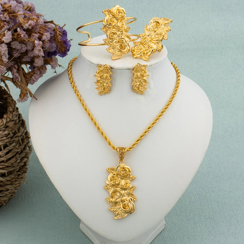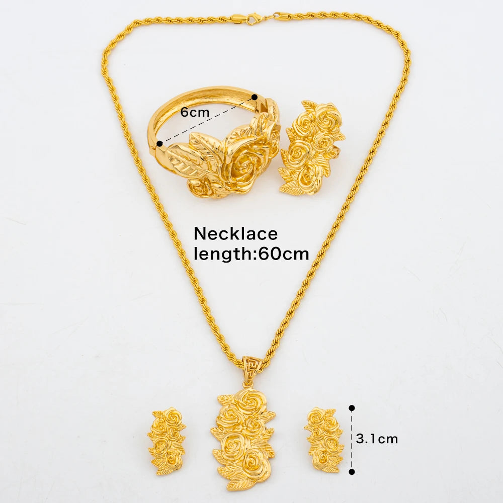 New Arrivals Gold Color Jewelry Sets For Women Fashion Earrings Necklace Italy Bangle Ring Flower Pendant Bride Wedding Party