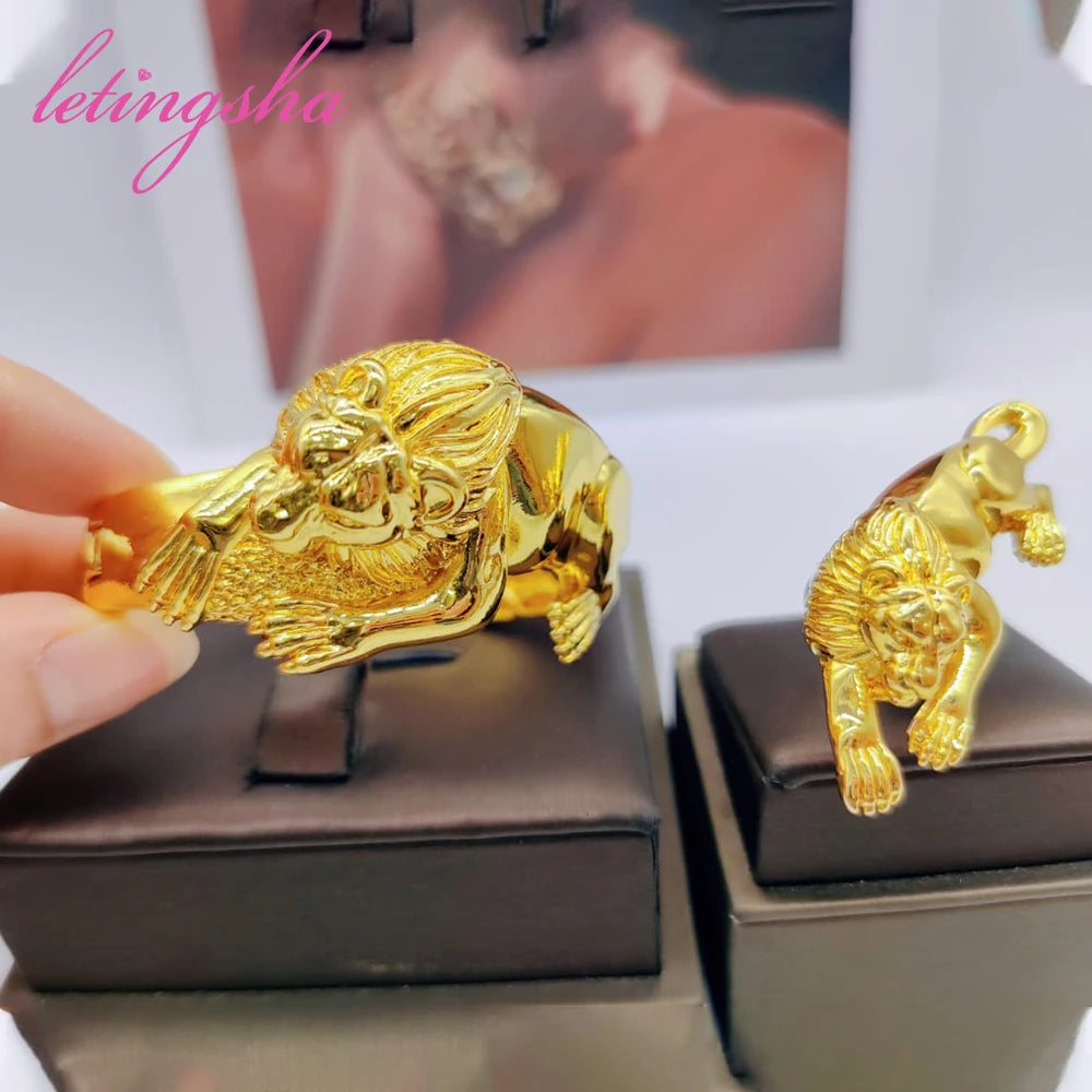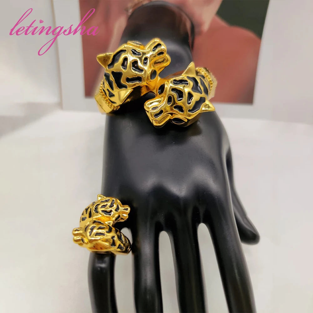 New Bangles Ring Set Leopard Design African 18k Gold Plated Bracelet Jewelry Set Dubai Bangle Daily Wear Party Gift