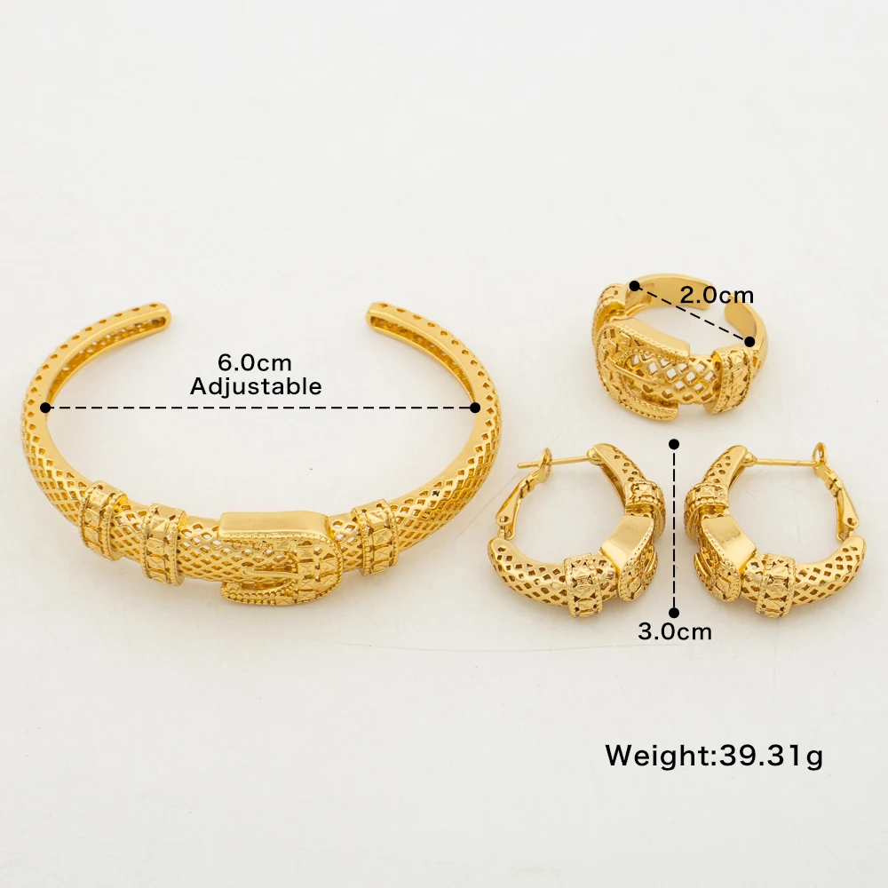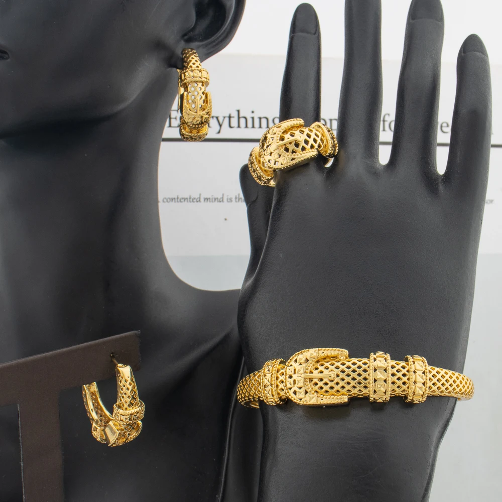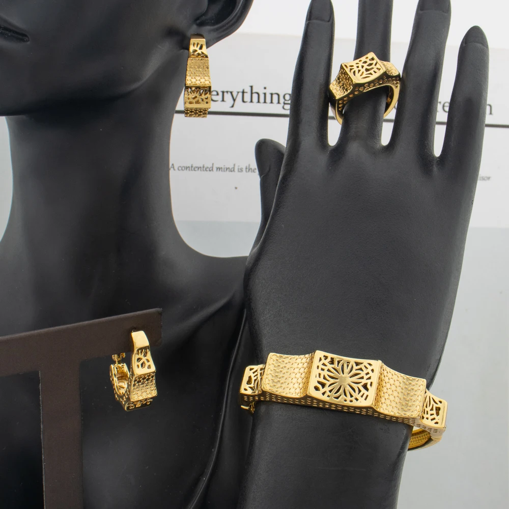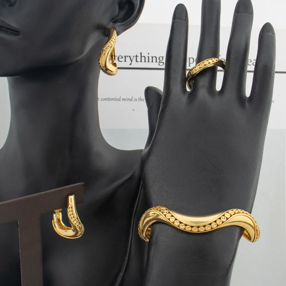 Original Gold Color Jewelry Set Women Exquisite Bangle Bracelet Ring Piercing Earrings African Ethiopia Bridal Anniversary Gift