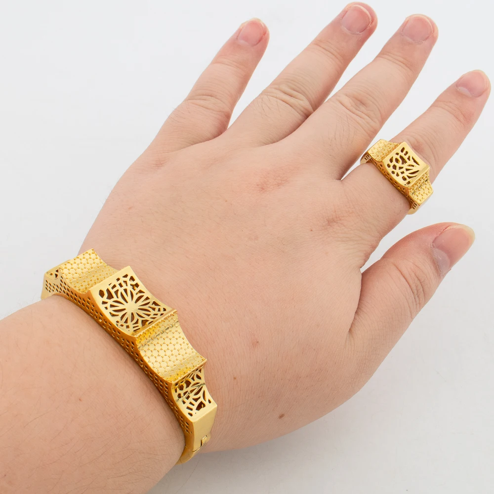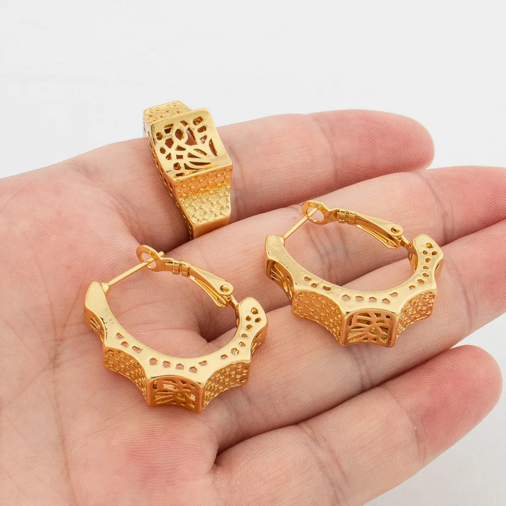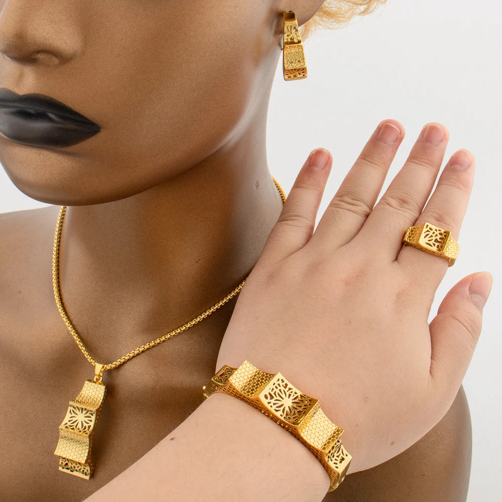 Trend Gold Color Jewelry Set for Women Hollow Design Earrings Geometry Design Bride Lady Italy France Fashion Bracelet Ring Gift