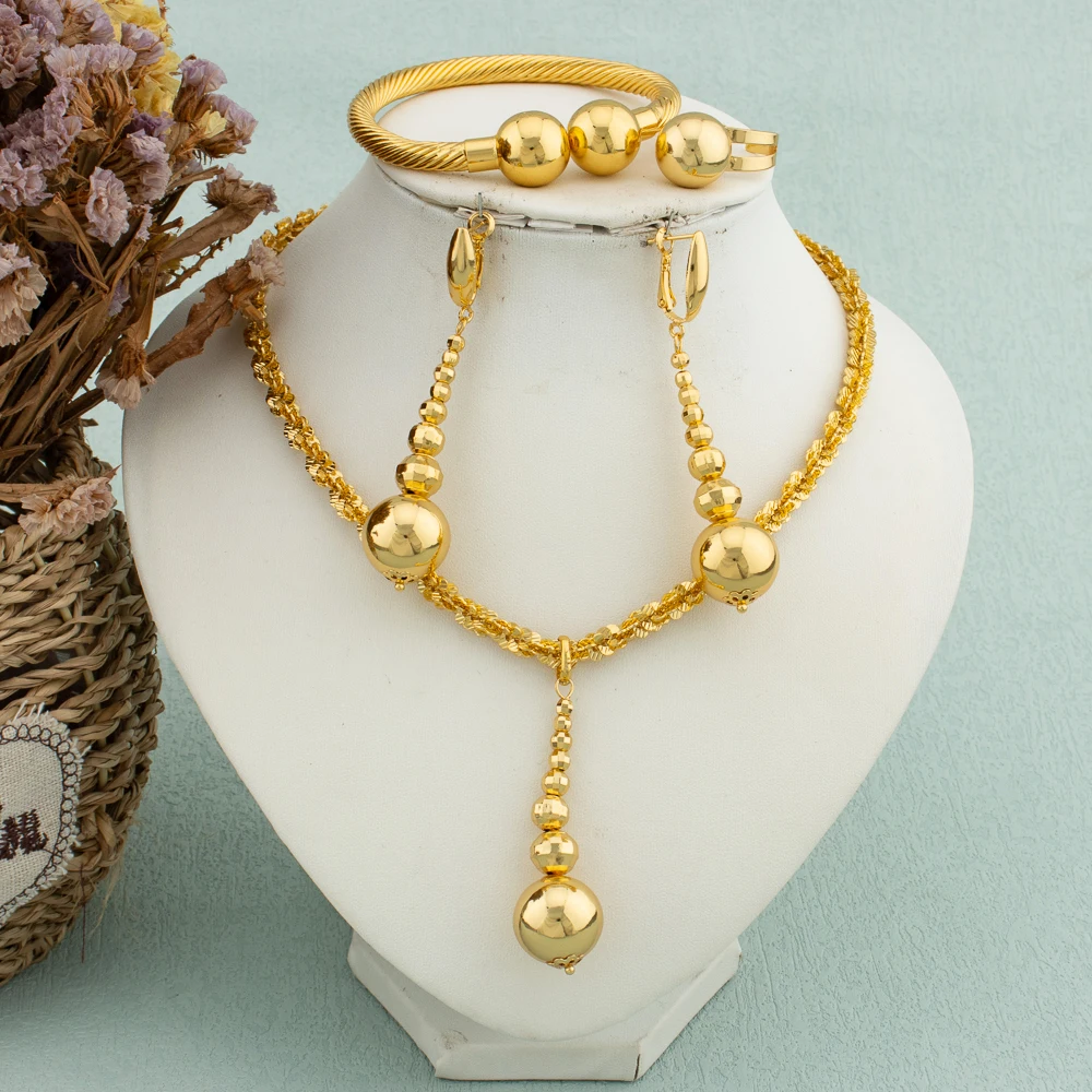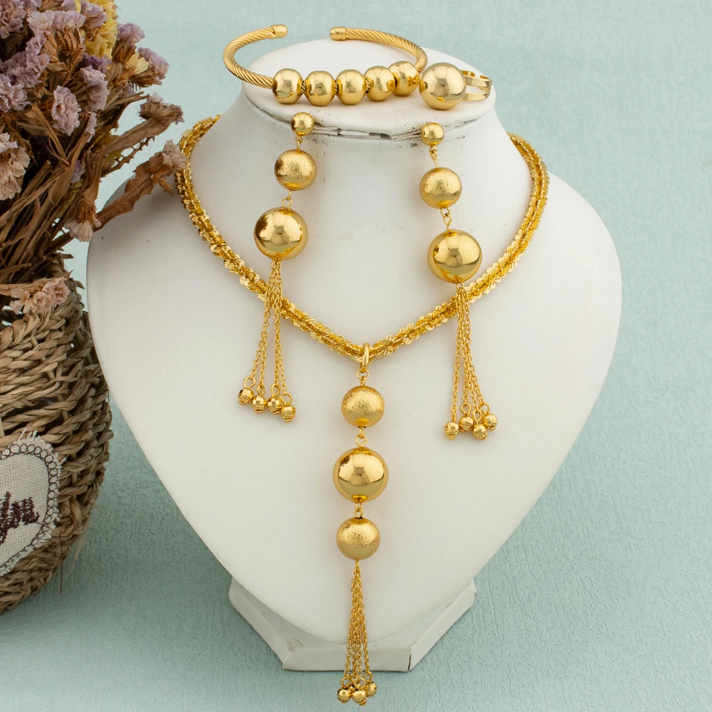 African Gold Color Jewelry Set for Women Glossy Multiple Small Bead Dubai Bridal Wedding Luxury Necklace Bracelet Earrings Ring