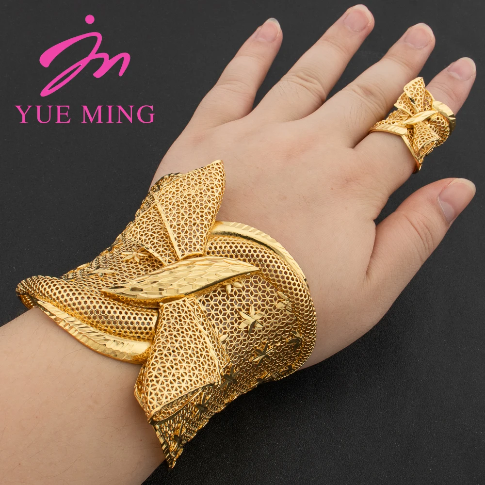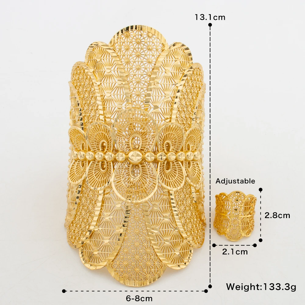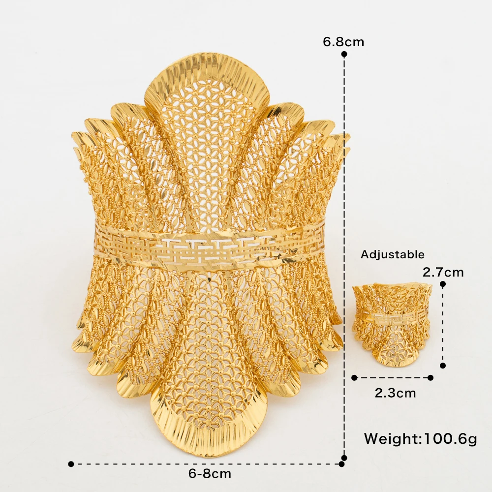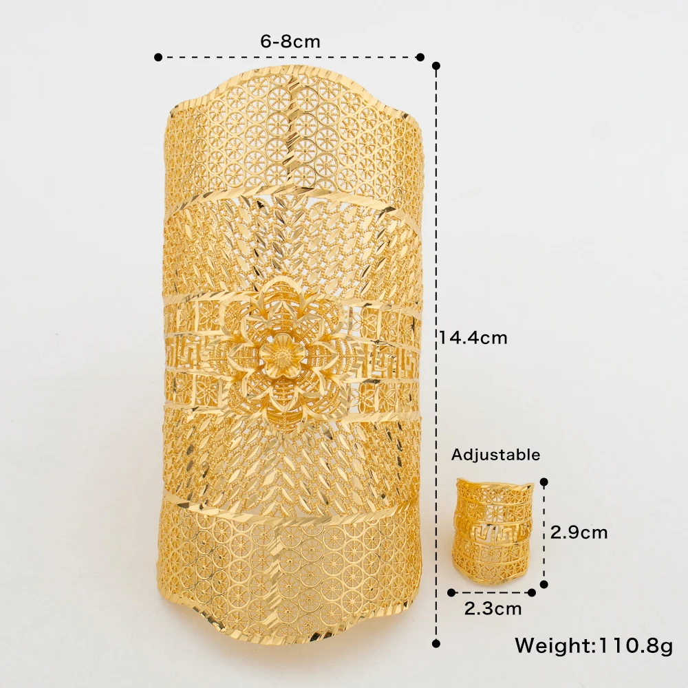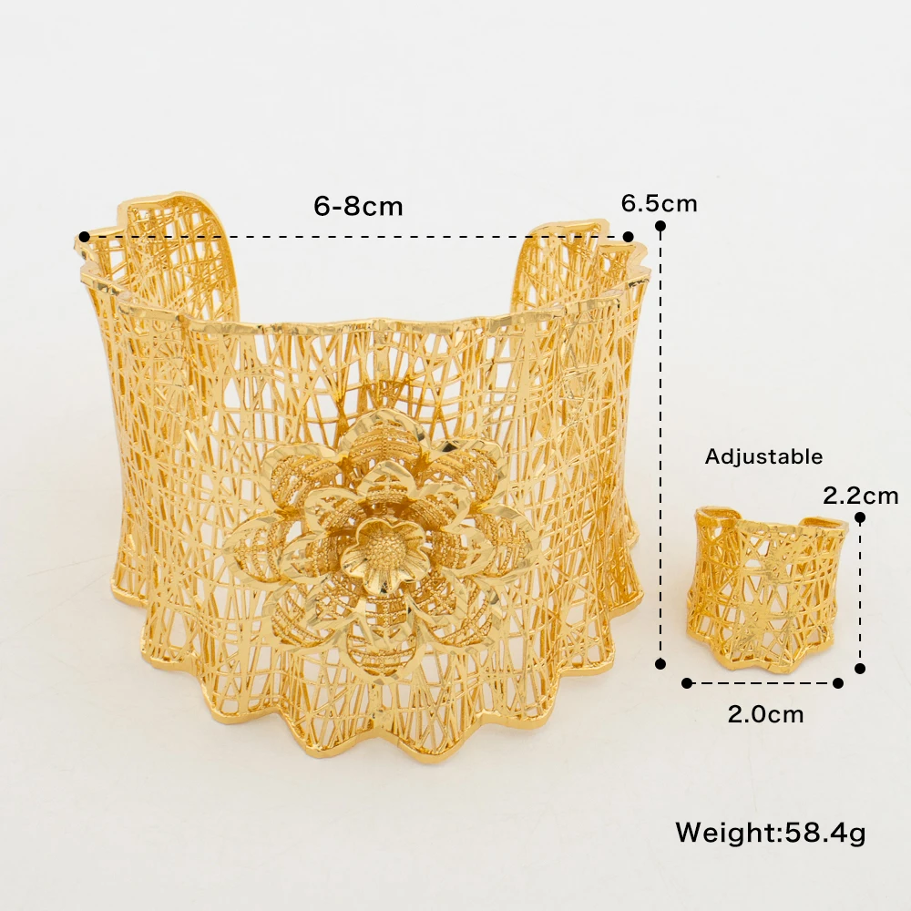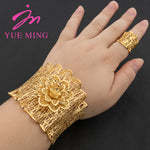 France Luxury Cuff Bangle with Ring For Women Dubai Gold Color Big Flower Bracelet Adjustable Ring Jewelry African Wedding Gifts