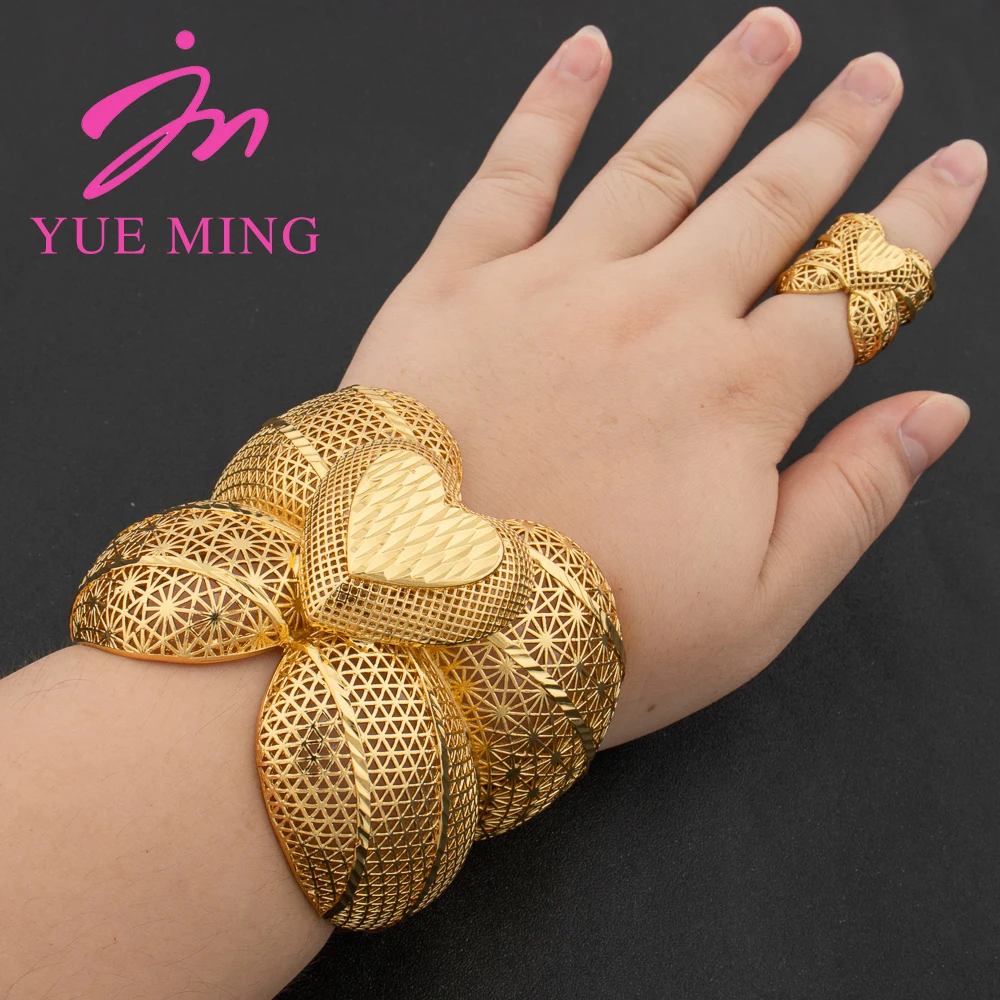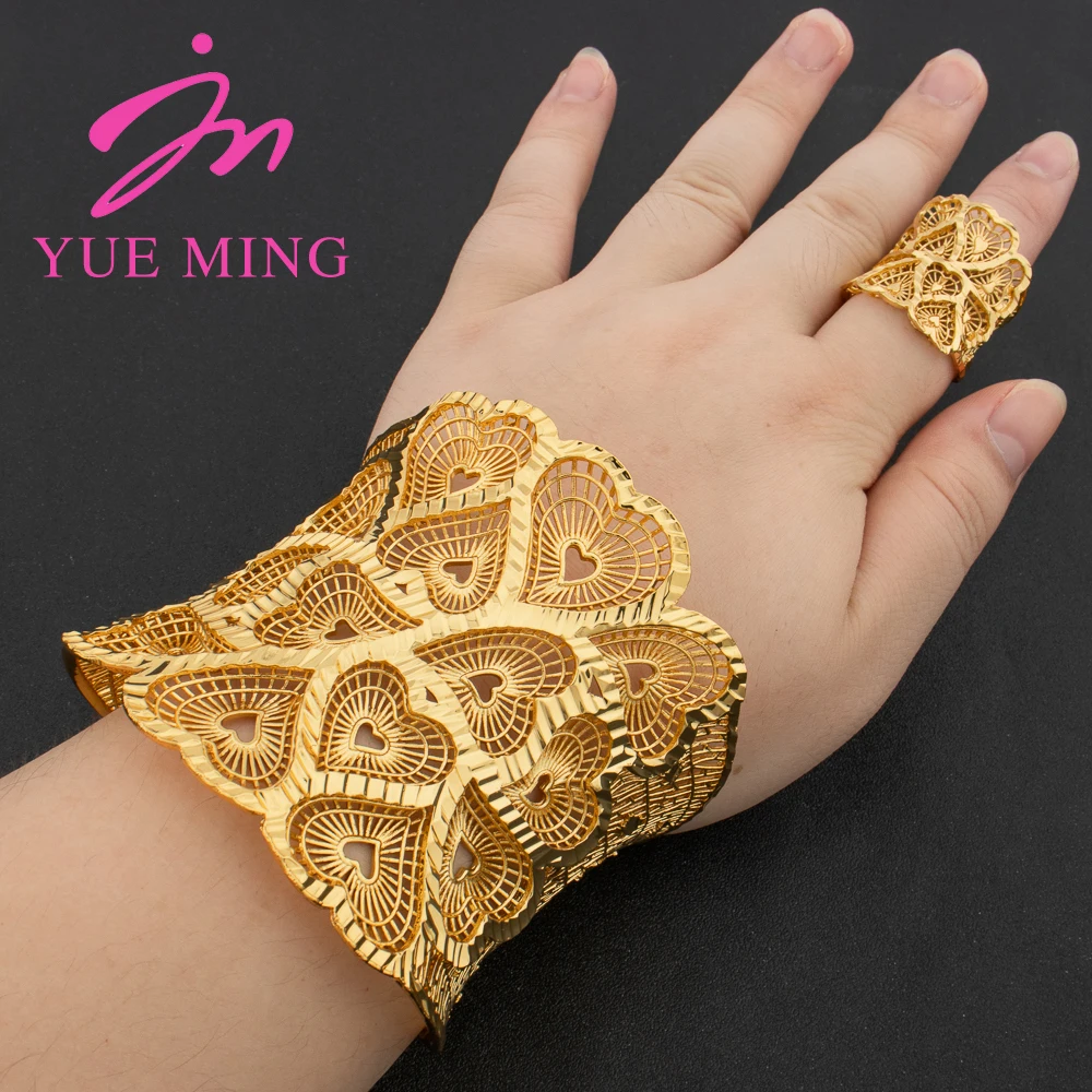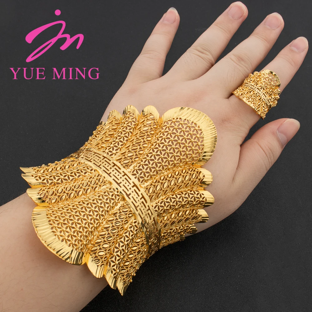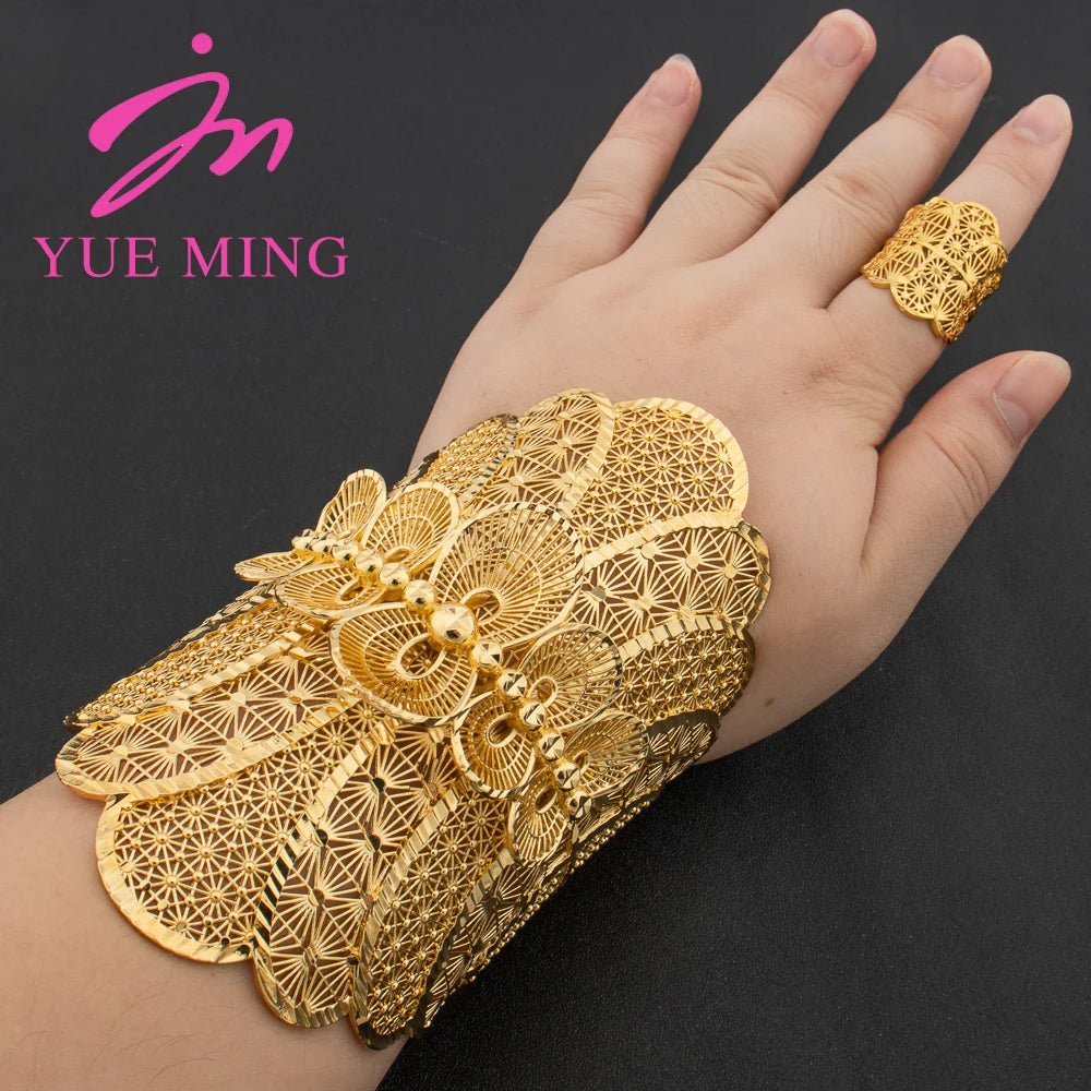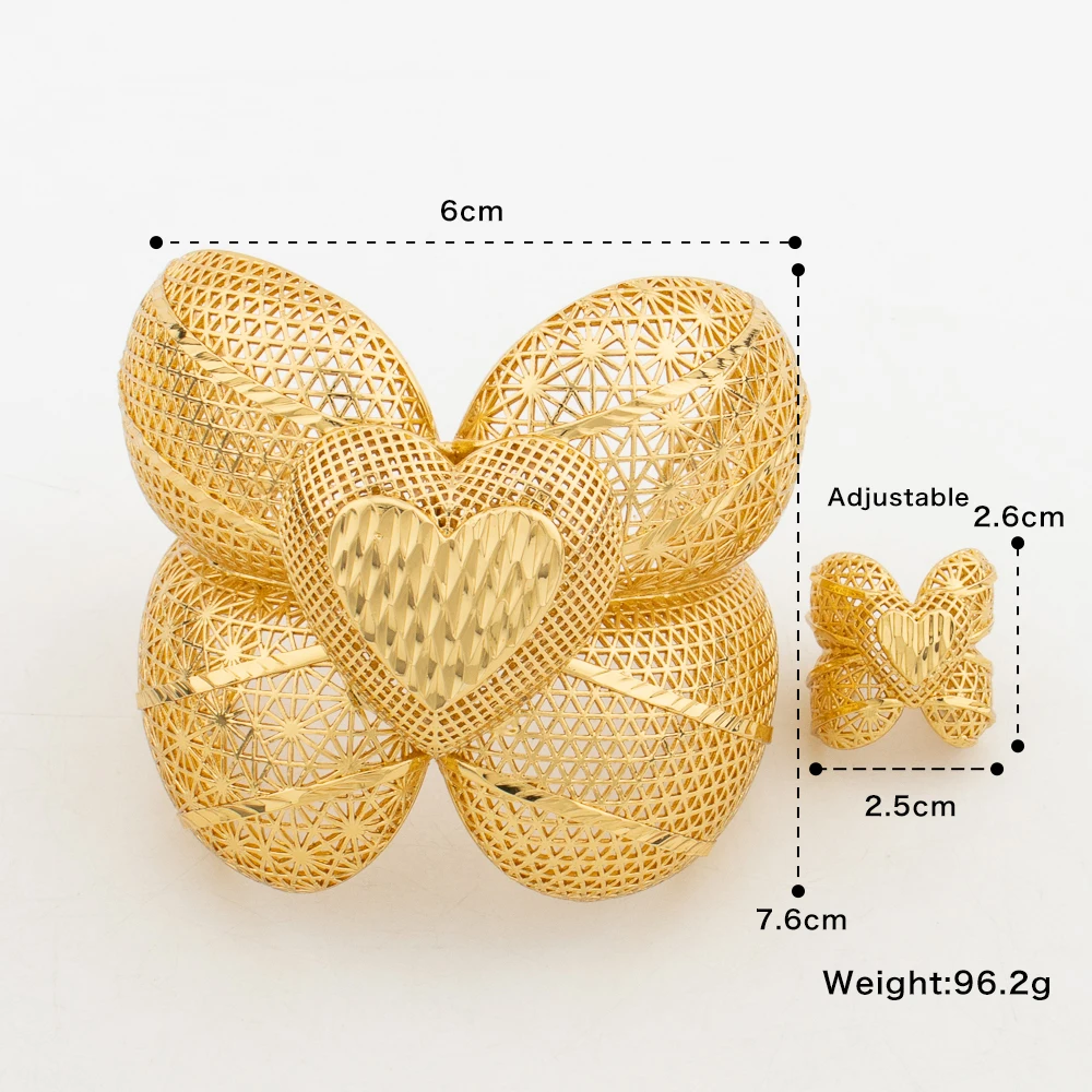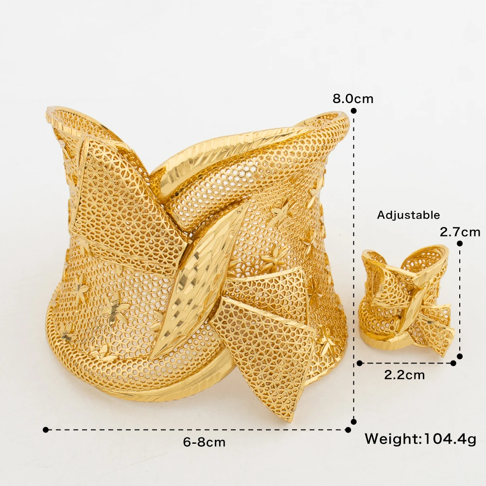 France Luxury Cuff Bangle with Ring For Women Dubai Gold Color Big Flower Bracelet Adjustable Ring Jewelry African Wedding Gifts