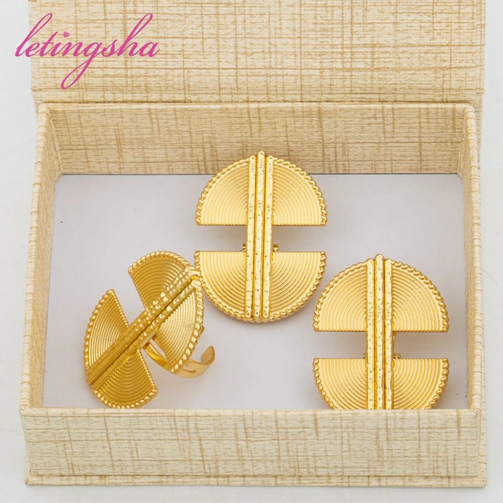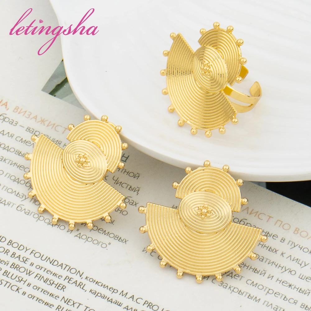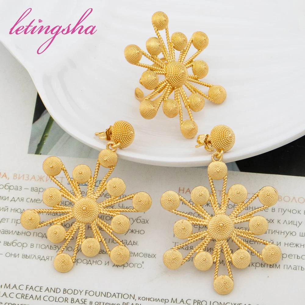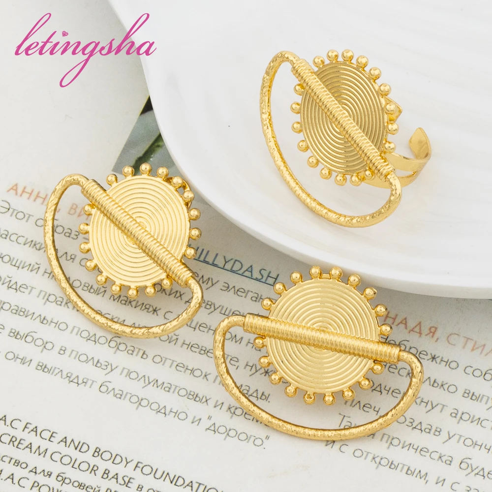 Dubai Gold Color Luxury Earrings and Rings Set African Ethiopian Jewelry Set for Women Fashion Wedding Jewelry Bride Party Gifts