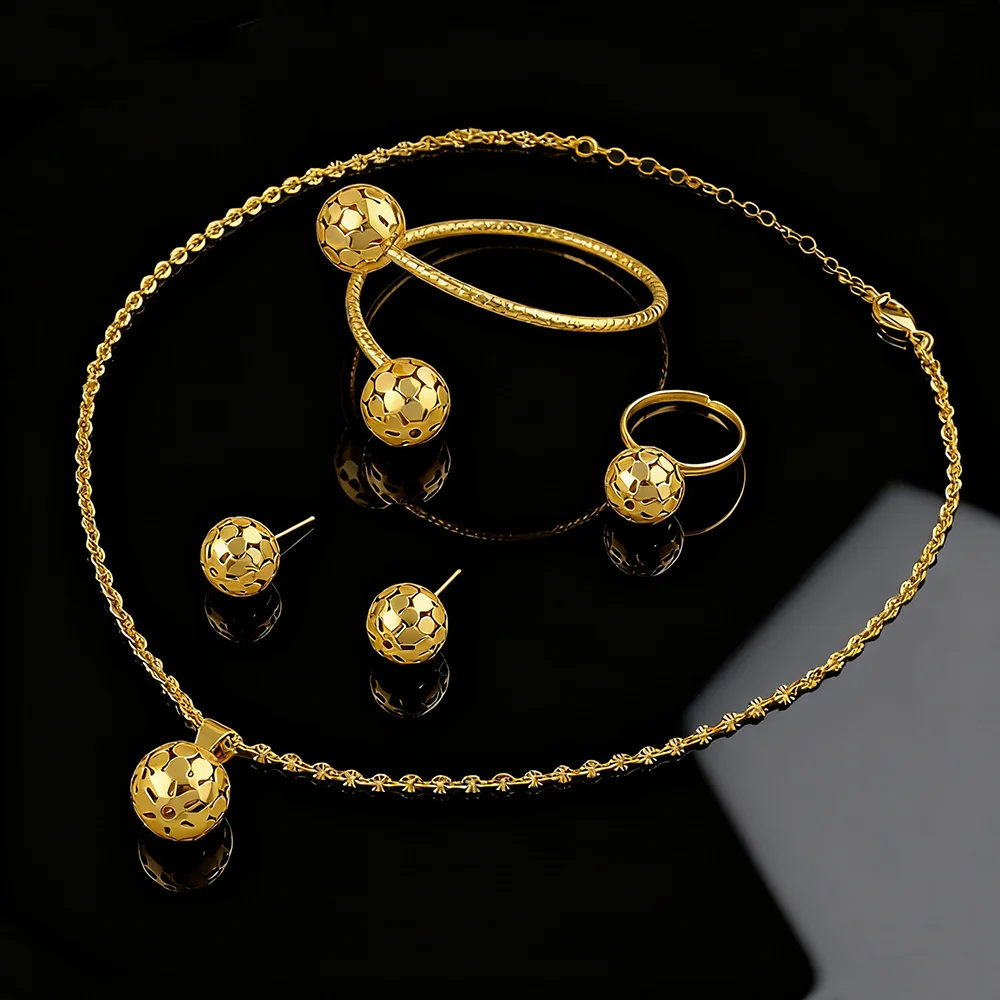 Fashion Gold Color Hollow circle Jewelry New Fashion Metal Jewelry Three-dimensional Ring Earring Necklace Four Piece Set Gift