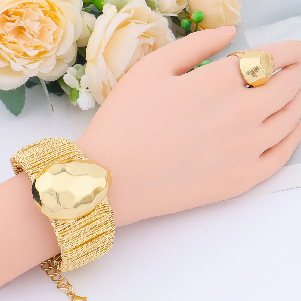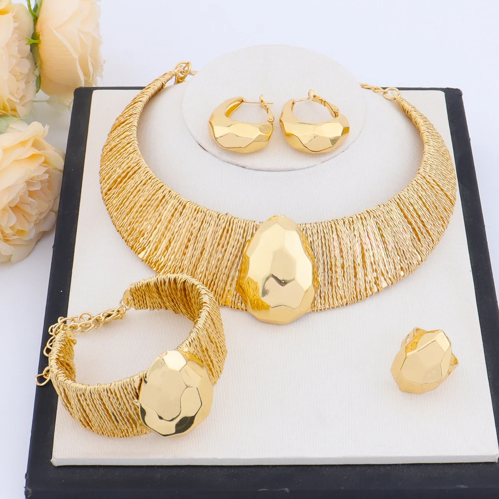 Gold Plated Noble Manual Weaving Necklace Earrings Bracelet Ring Set for Women Design Jewelry Gift for Party Wedding Christmas
