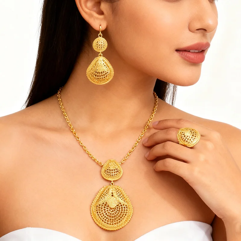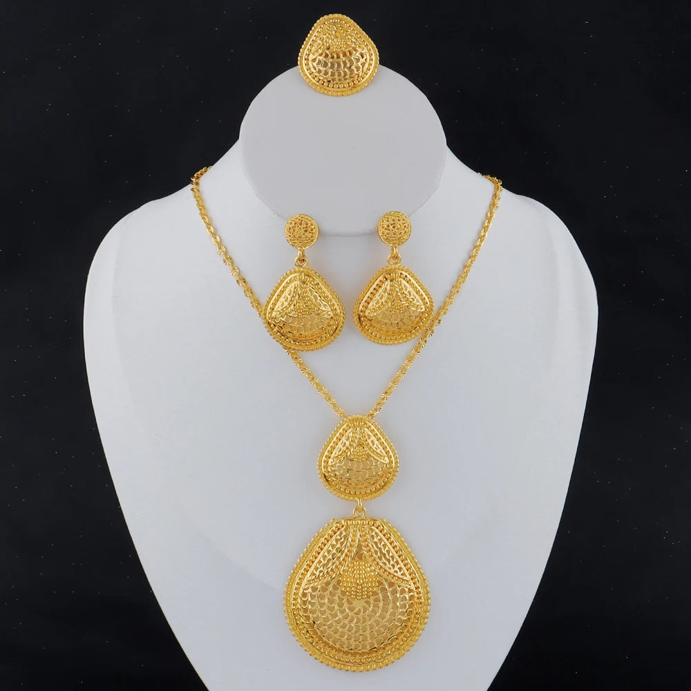 luxury gold plated woman jewelry set Gold Color Necklace And Earrings Rings Jewelry Set For Women Ethiopian Bridal jewelry gifts